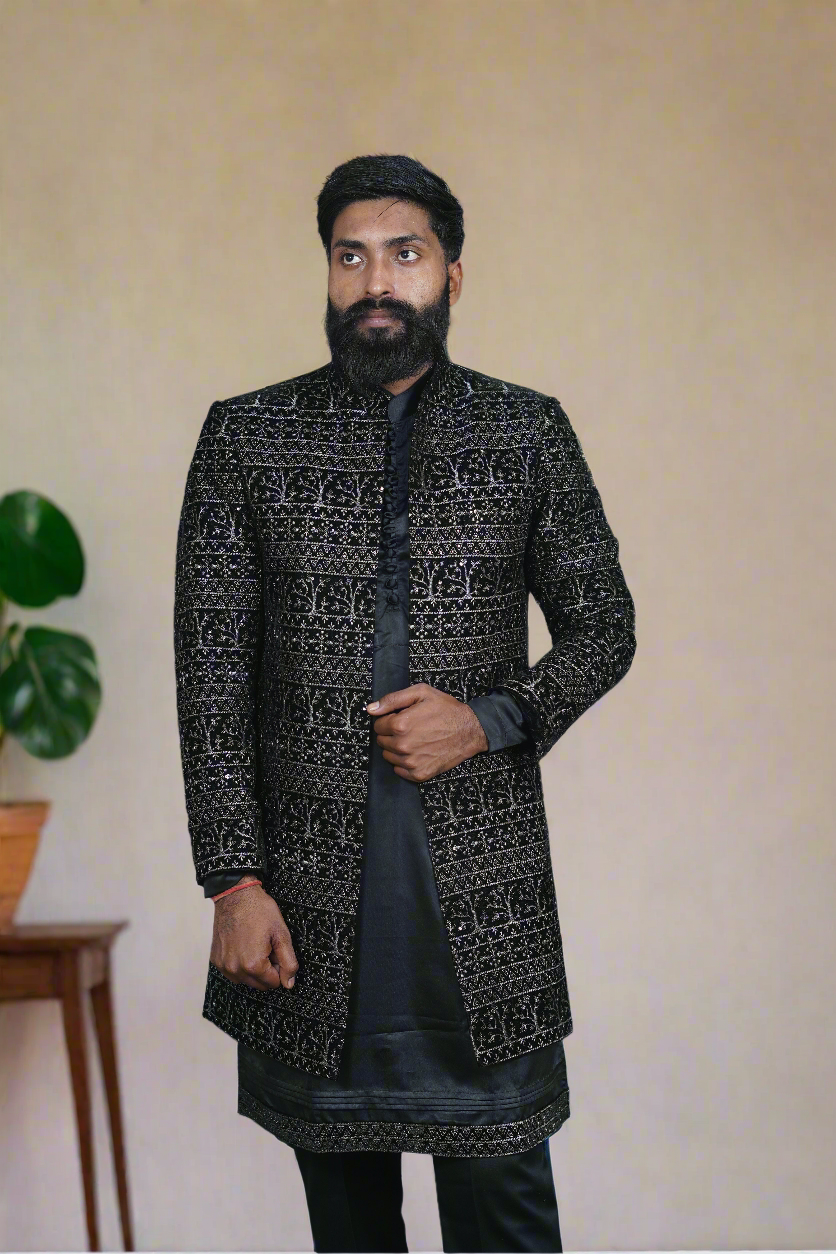 Experience timeless elegance with our Men's Exclusive Velvet Open Indo-Western Set. This exquisite ensemble combines traditional charm with modern sophistication, crafted from premium velvet fabric for a luxurious finish. The open-style design adds a contemporary edge, making it perfect for weddings, receptions, or festive celebrations. This outfit is meticulously handcrafted, showcasing intricate detailing that elevates your style quotient.