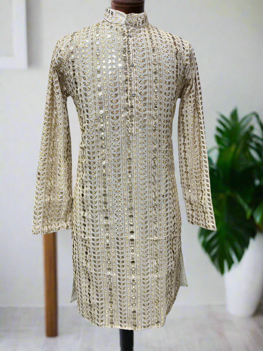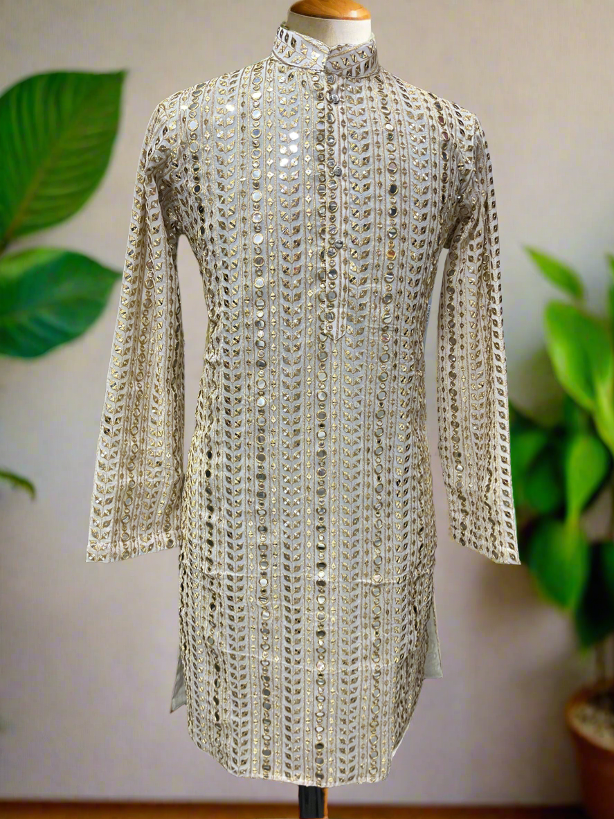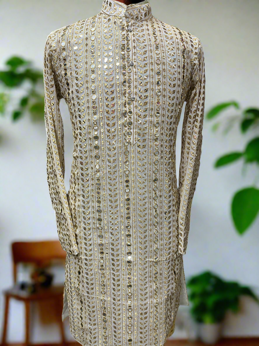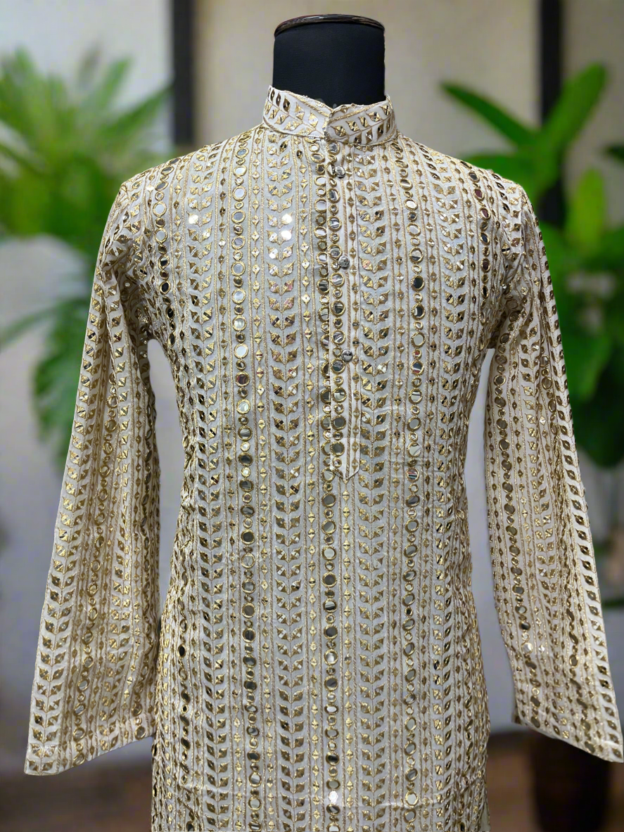 Exude opulence and sophistication with the Men's Exclusive Gold Mirror Work Designer Kurta Set from KPH Outfits. This kurta set combines traditional craftsmanship with modern elegance, featuring intricate gold mirror work that adds a dazzling flair to your attire. Whether for festive occasions, weddings, or grand celebrations, this ensemble ensures you stand out with unmatched grace.