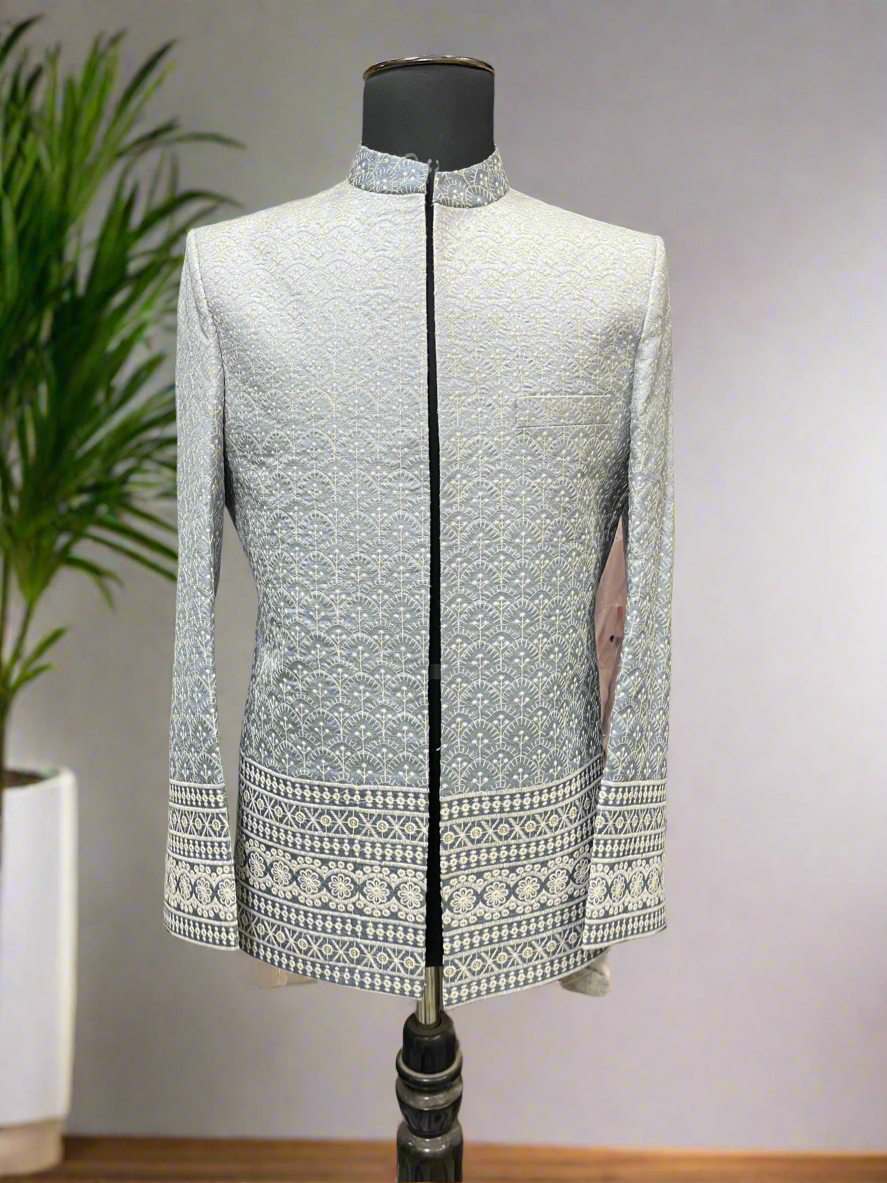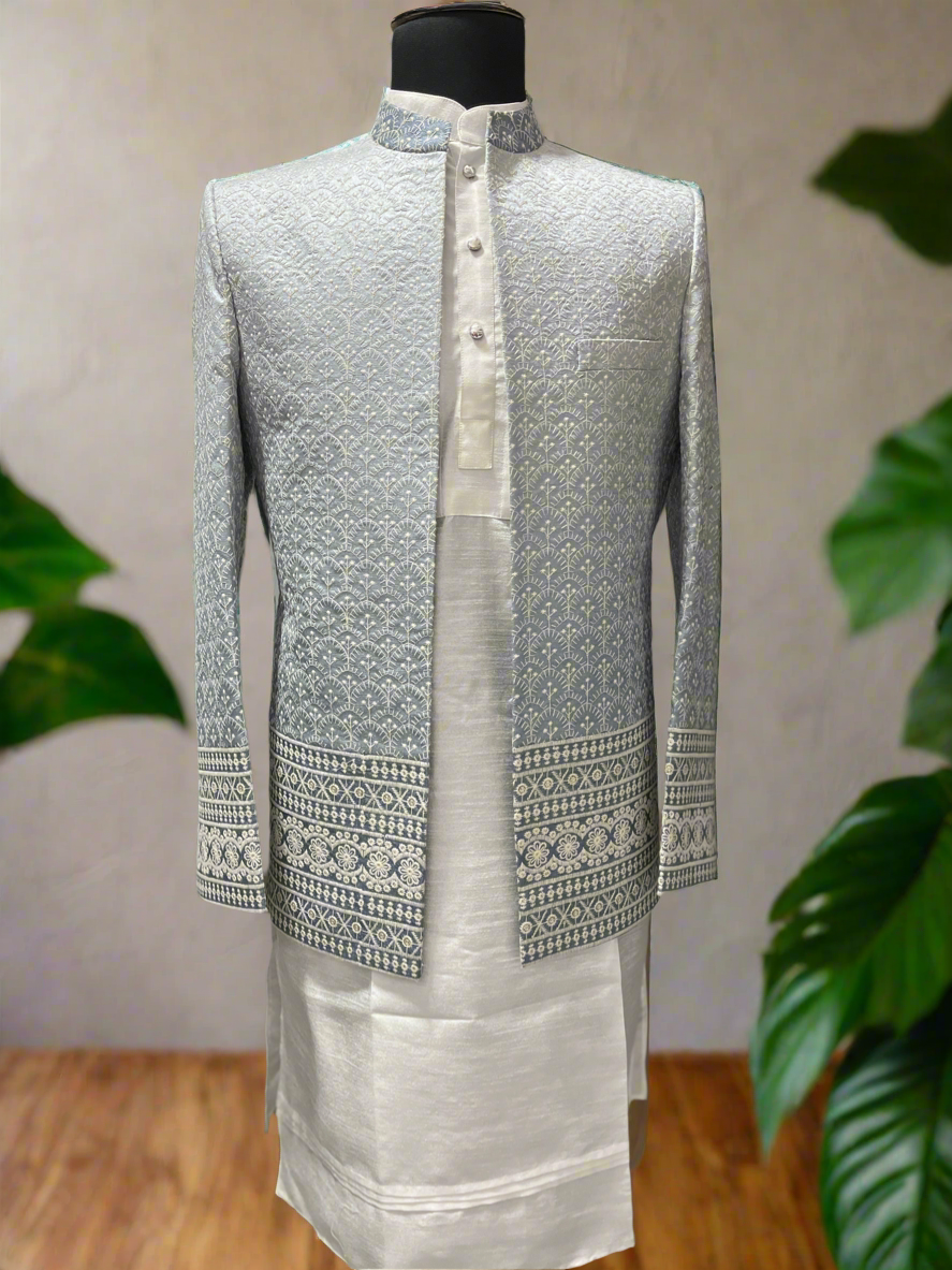 Elevate your style quotient with the Men's Exclusive Grey Open Jodhpuri Set, a perfect blend of tradition and modern sophistication. Designed for special occasions, this ensemble features a classic grey hue that exudes understated elegance and a distinctive open-style design that sets it apart. Crafted for the discerning gentleman, the Jodhpuri set offers a regal charm while ensuring a tailored, comfortable fit.