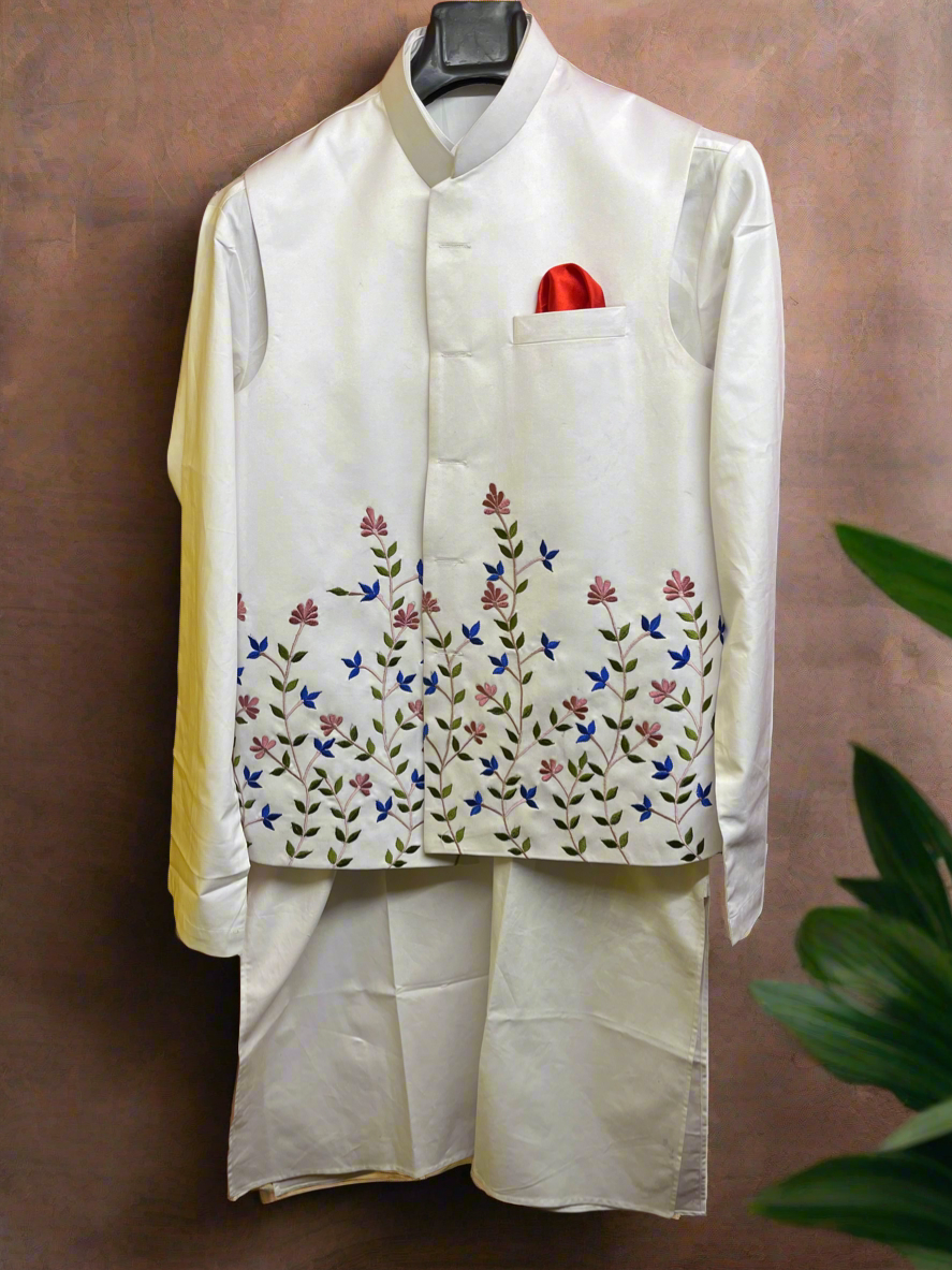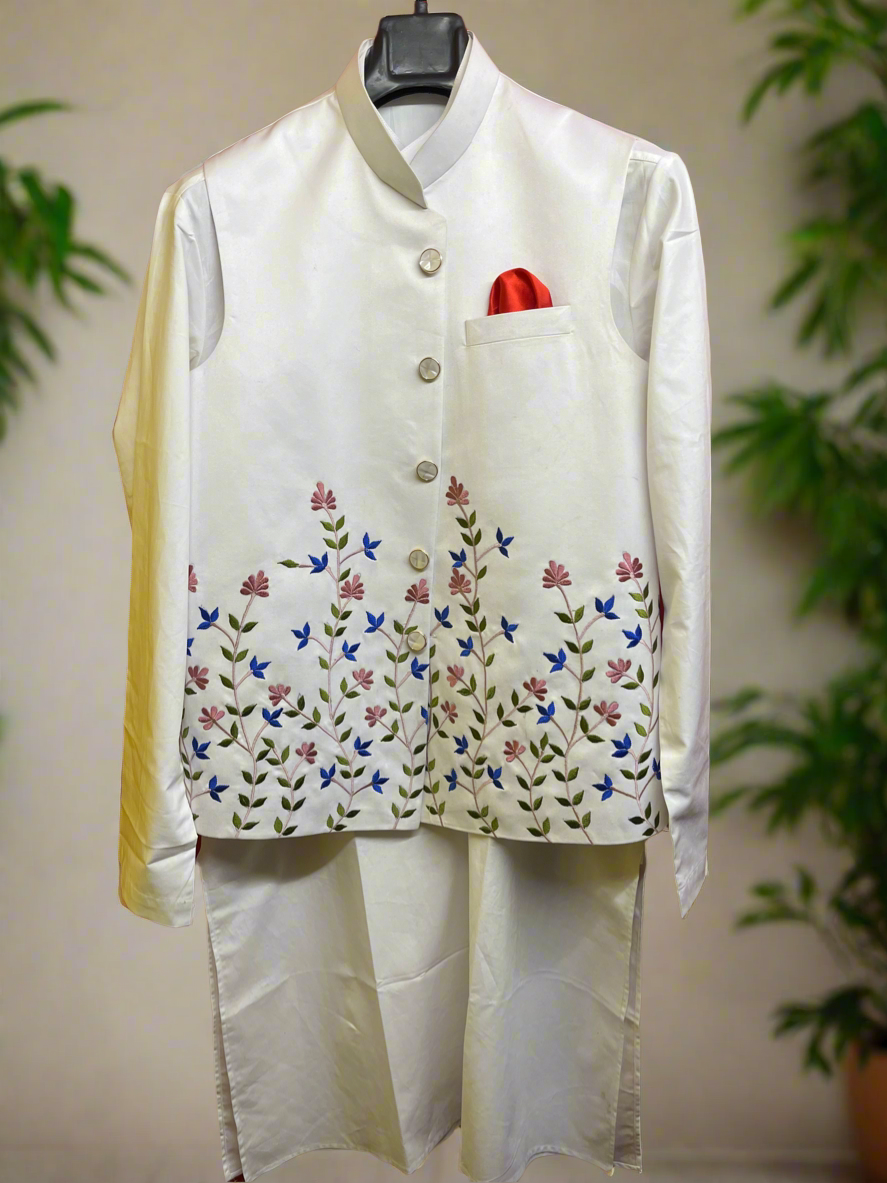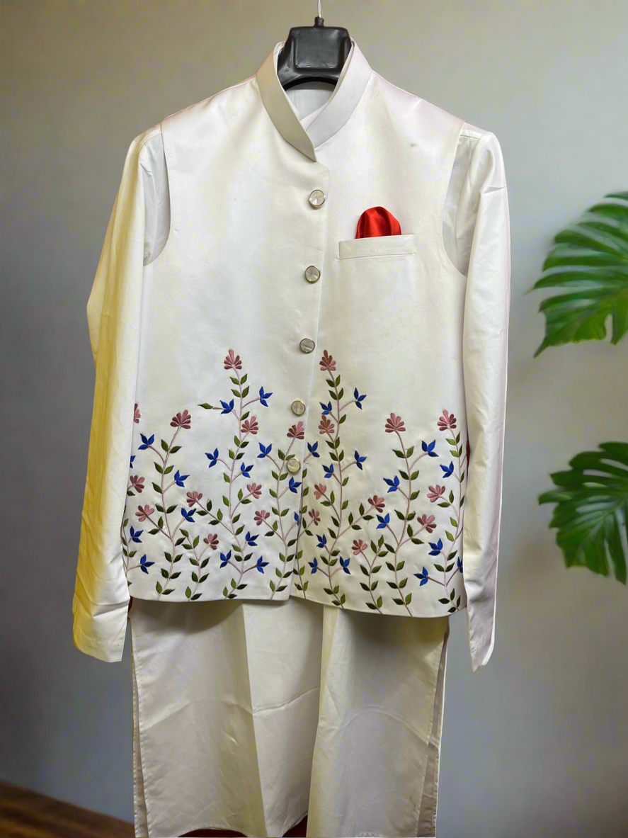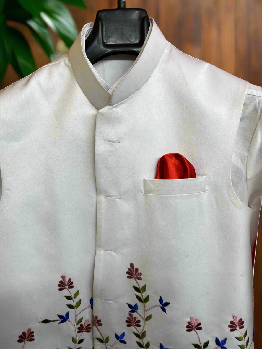 Designed with intricate handwork and premium fabric, this waistcoat offers comfort and style throughout your celebrations. Whether you are walking down the aisle or posing for pictures with your groomsmen, this waistcoat ensures you look your best. Its timeless design paired with the striking multi-colour embellishments makes it suitable for various wedding themes, from traditional to contemporary.