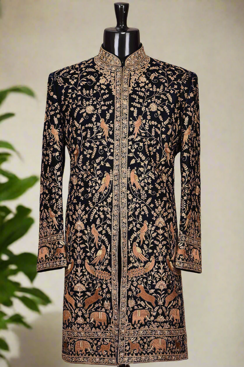 Celebrate your big day in style with the Men's Exclusive Wedding Special Embellished Sherwani Set by KPH Outfits. Meticulously designed for grooms and wedding attendees, this sherwani set showcases an impeccable blend of luxury and tradition. The intricate embellishments exude a regal aura, making it the perfect choice for weddings, receptions, and other festive occasions.
