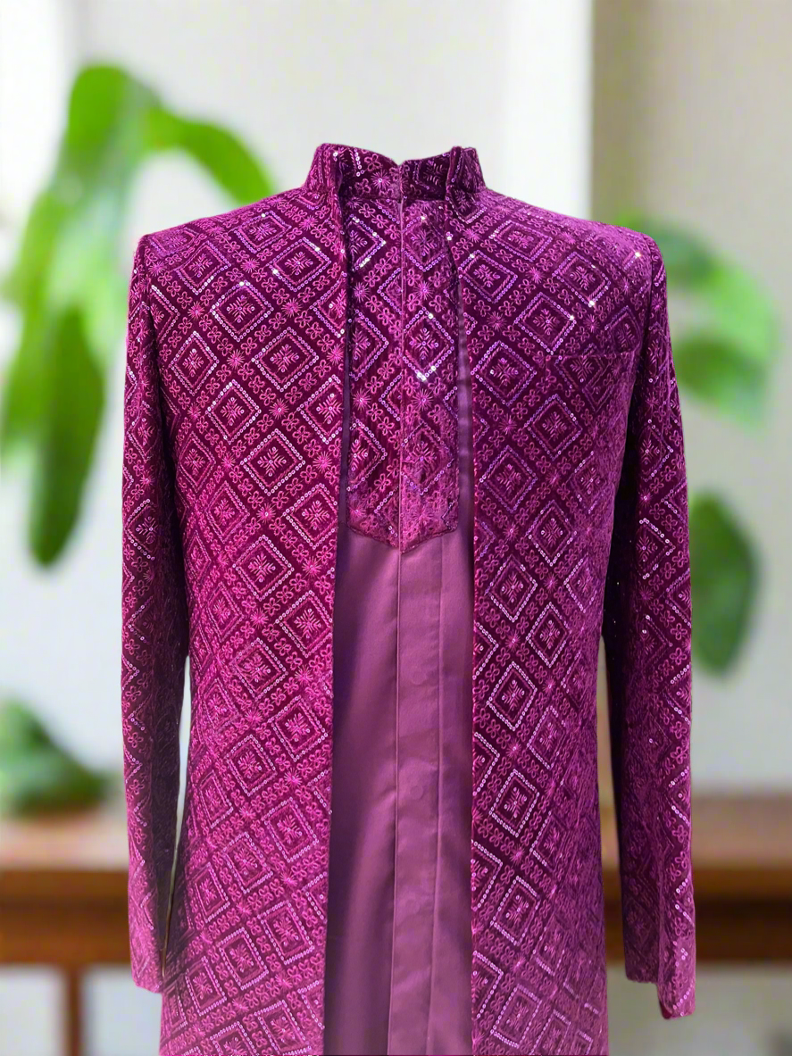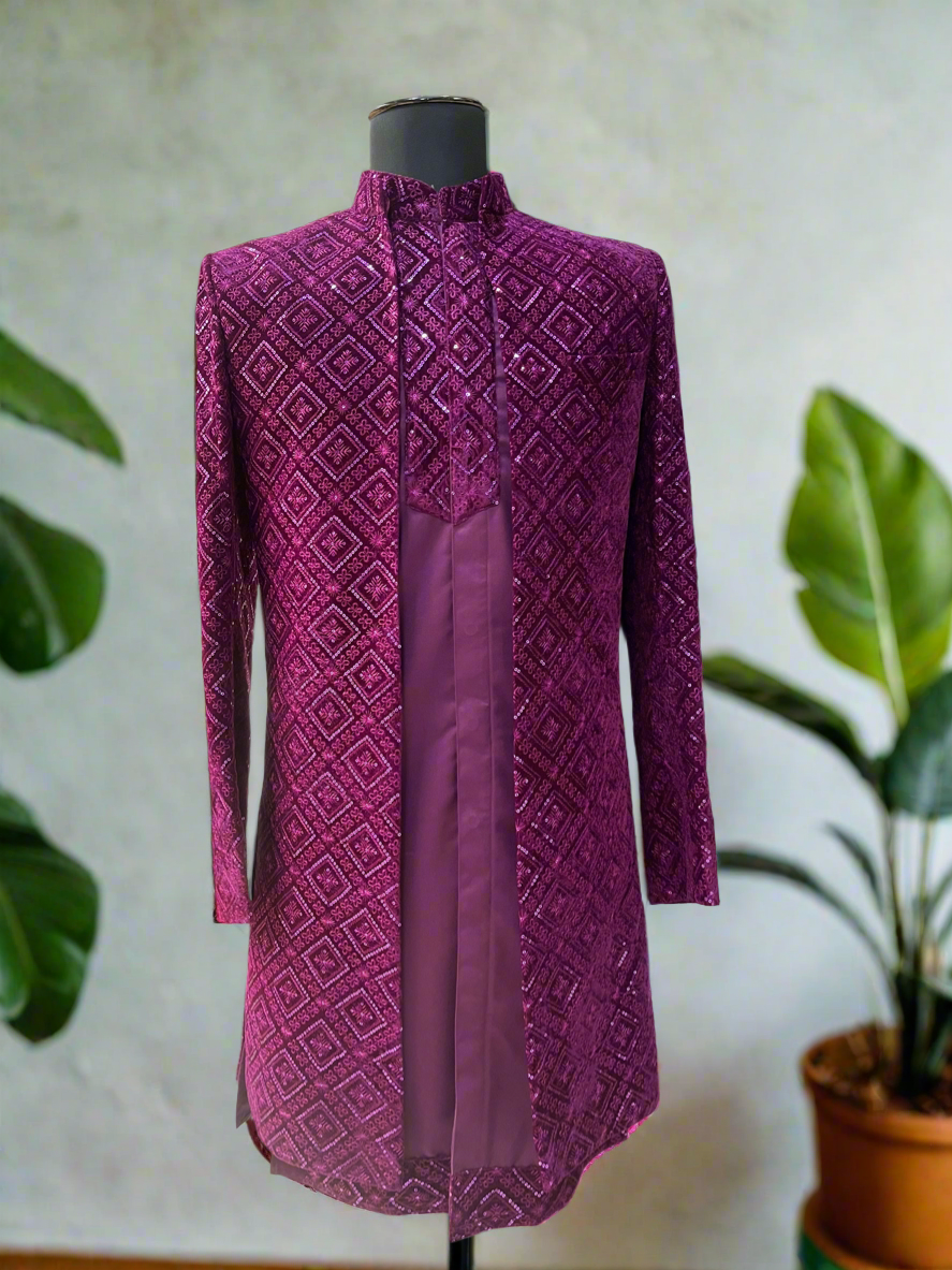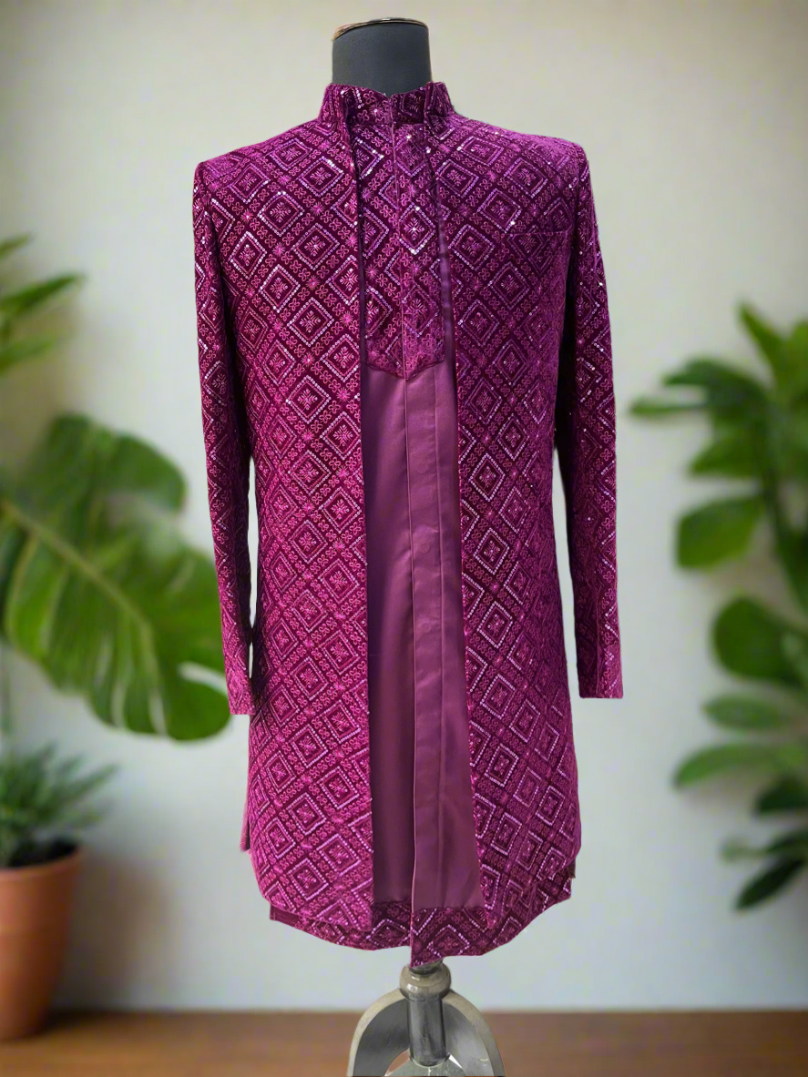 The Wedding Special Wine Velvet Open Indo-western Set is designed to elevate your wedding wardrobe with a luxurious and contemporary touch. Crafted from premium velvet fabric, this Indo-western set features a stunning wine hue that reflects elegance and charm. The open-front design adds a modern twist to this traditional outfit, making it the perfect choice for grooms and guests who want to blend comfort with high-end style on their special day.